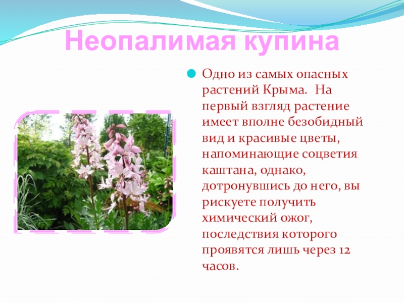 Неопалимая купинаОдно из самых опасных растений Крыма. На первый взгляд растение имеет вполне безобидный вид и красивые