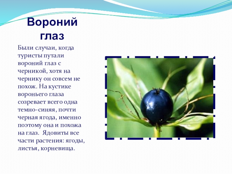 на чернику он совсем не похож. На кустике вороньего глаза созревает всего одна темно-синяя, почти черная ягода, именно поэтому она и похожа на глаз.  Ядовиты все части растения: ягоды, листья, корневища.