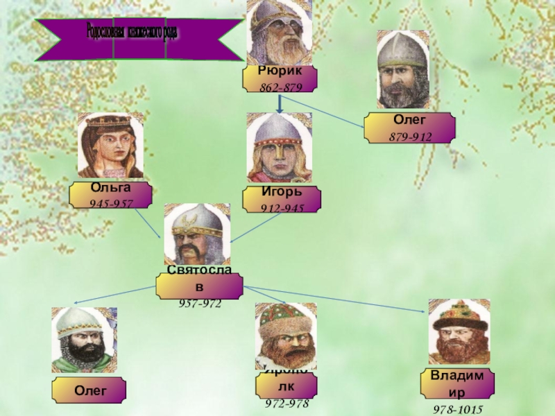 Рюрик862-879Игорь912-945Олег879-912 ОлегЯрополк972-978Святослав957-972Ольга945-957 Владимир978-1015Родословная княжеского рода