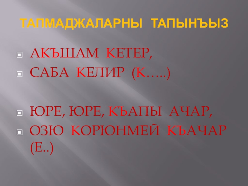 ТАПМАДЖАЛАРНЫ ТАПЫНЪЫЗАКЪШАМ КЕТЕР,САБА КЕЛИР (К…..)ЮРЕ, ЮРЕ, КЪАПЫ АЧАР,ОЗЮ КОРЮНМЕЙ КЪАЧАР (Е..)