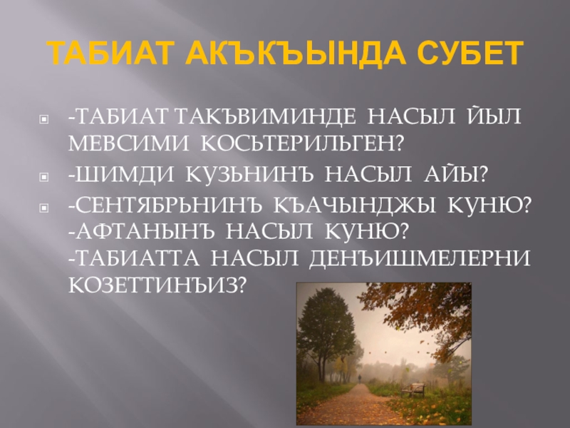 -СЕНТЯБРЬНИНЪ КЪАЧЫНДЖЫ КУНЮ? -АФТАНЫНЪ НАСЫЛ КУНЮ? -ТАБИАТТА НАСЫЛ ДЕНЪИШМЕЛЕРНИ КОЗЕТТИНЪИЗ?