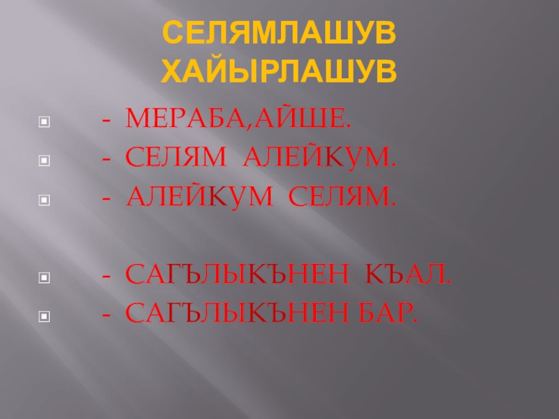 СЕЛЯМЛАШУВ ХАЙЫРЛАШУВ   - МЕРАБА,АЙШЕ.    - СЕЛЯМ АЛЕЙКУМ.   - АЛЕЙКУМ СЕЛЯМ.