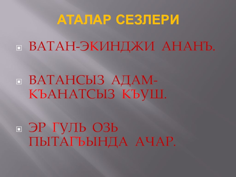 АТАЛАР СЕЗЛЕРИВАТАН-ЭКИНДЖИ АНАНЪ.ВАТАНСЫЗ АДАМ- КЪАНАТСЫЗ КЪУШ.ЭР ГУЛЬ ОЗЬ ПЫТАГЪЫНДА АЧАР.