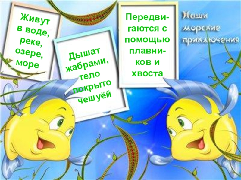 Живут в воде, реке, озере, мореДышат жабрами, тело покрыто чешуёйПередви-гаются с помощью плавни-ков и хвоста
