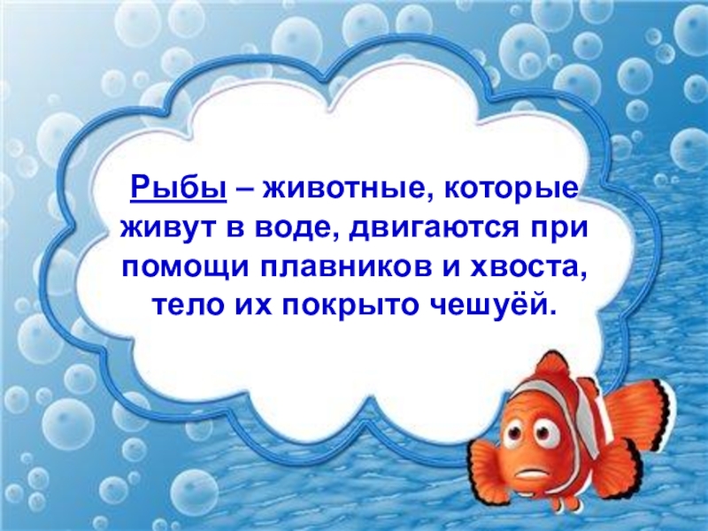 Слайд 6Рыбы – животные, которые живут в воде, двигаются при помощи плавников