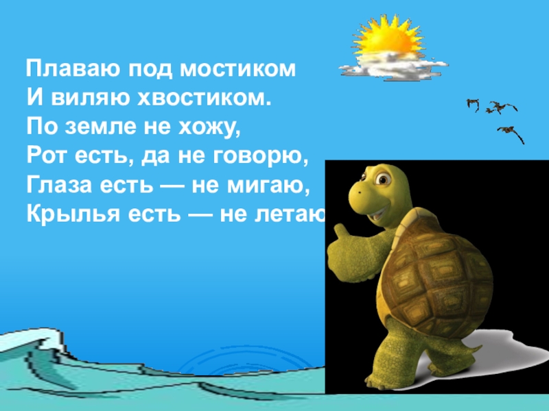 Слайд 2 Плаваю под мостиком И виляю хвостиком. По земле не хожу, Рот есть,