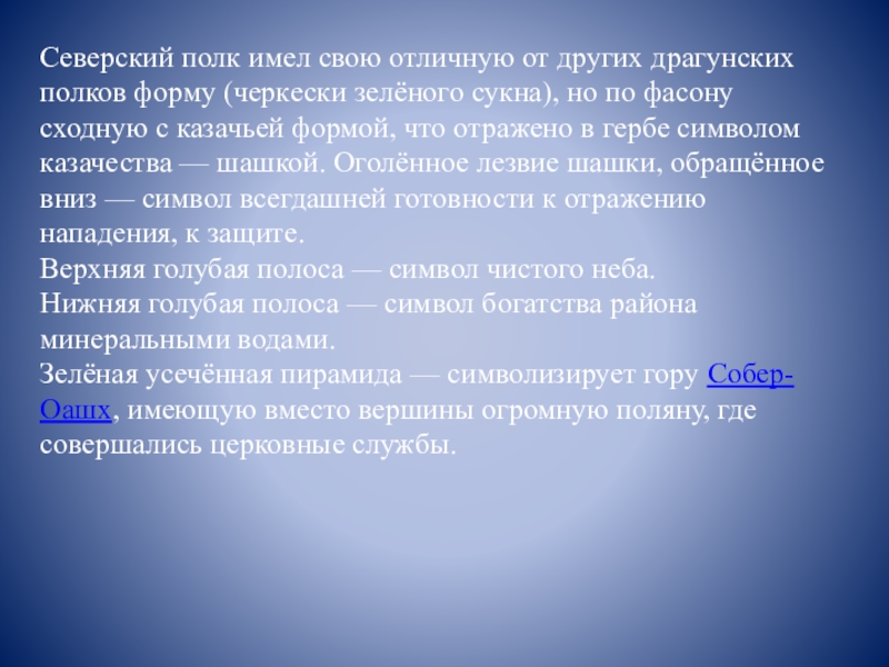 зелёного сукна), но по фасону сходную с казачьей формой, что отражено в гербе символом казачества — шашкой. Оголённое лезвие шашки, обращённое вниз — символ всегдашней готовности к отражению нападения, к защите.