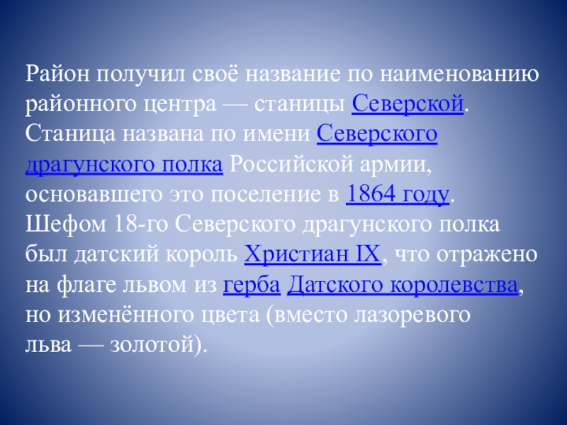 Слайд 4Район получил своё название по наименованию районного центра — станицы Северской. Станица