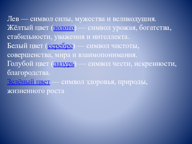 Голубой цвет (лазурь) — символ чести, искренности, благородства.