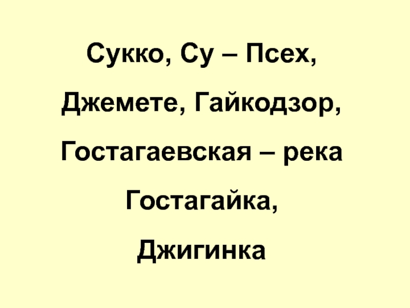 Сукко, Су – Псех,Джемете, Гайкодзор, Гостагаевская – река Гостагайка, Джигинка