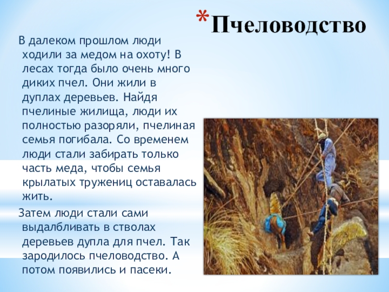 лесах тогда было очень много диких пчел. Они жили в дуплах деревьев. Найдя пчелиные жилища, люди их полностью разоряли, пчелиная семья погибала. Со временем люди стали забирать только часть меда, чтобы семья крылатых тружениц оставалась жить.
