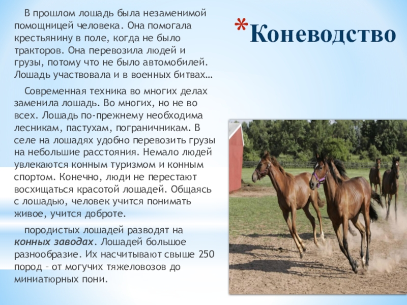 в поле, когда не было тракторов. Она перевозила людей и грузы, потому что не было автомобилей. Лошадь участвовала и в военных битвах…