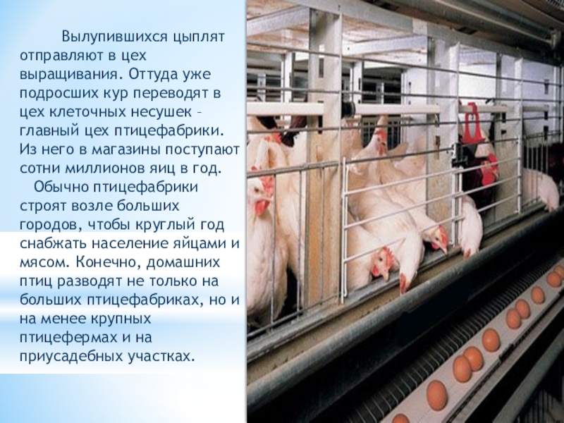 Обычно птицефабрики строят возле больших городов, чтобы круглый год снабжать население яйцами и мясом. Конечно, домашних птиц разводят не только на больших птицефабриках, но и на менее крупных птицефермах и на приусадебных участках.