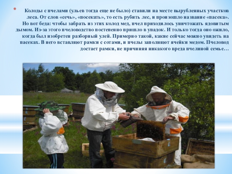 Слайд 13 Колоды с пчелами (ульев тогда еще не было) ставили на месте