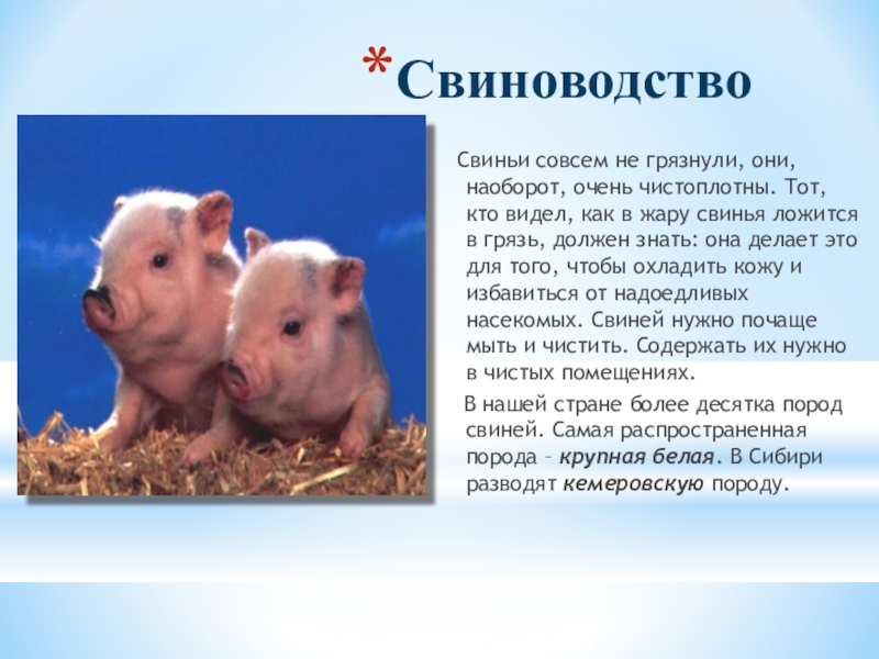В нашей стране более десятка пород свиней. Самая распространенная порода – крупная белая. В Сибири разводят кемеровскую породу.