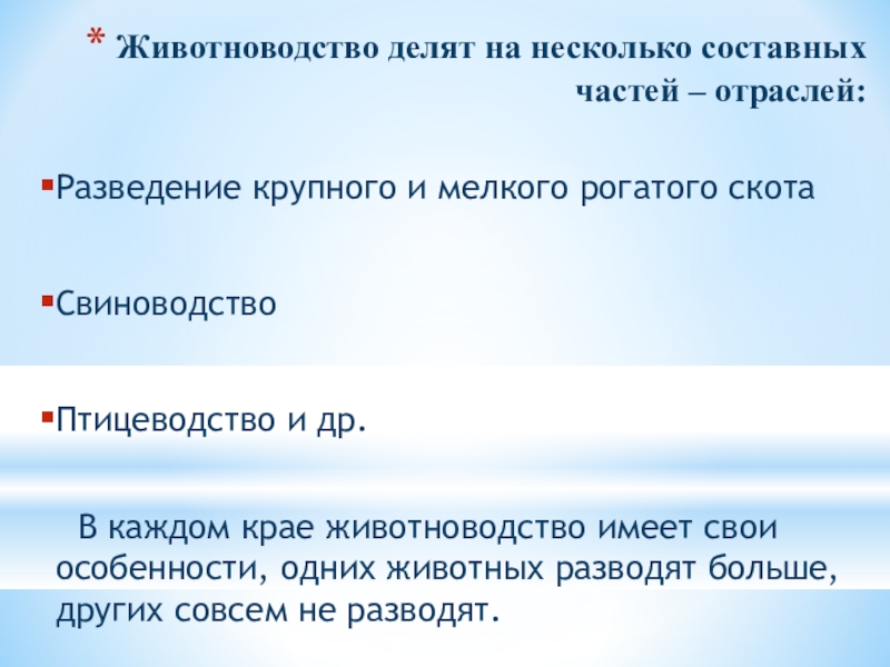 Слайд 3Животноводство делят на несколько составных частей – отраслей: