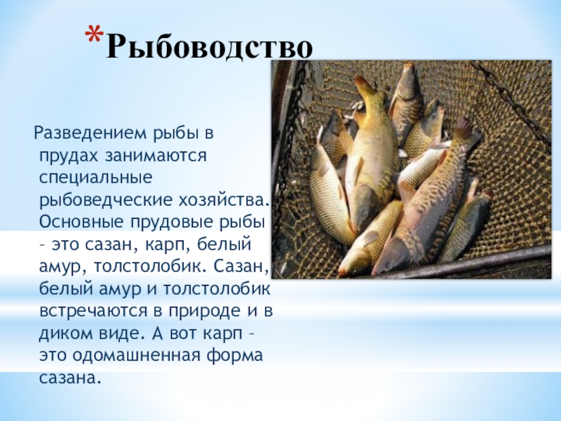 Разведением рыбы в прудах занимаются специальные рыбоведческие хозяйства. Основные прудовые