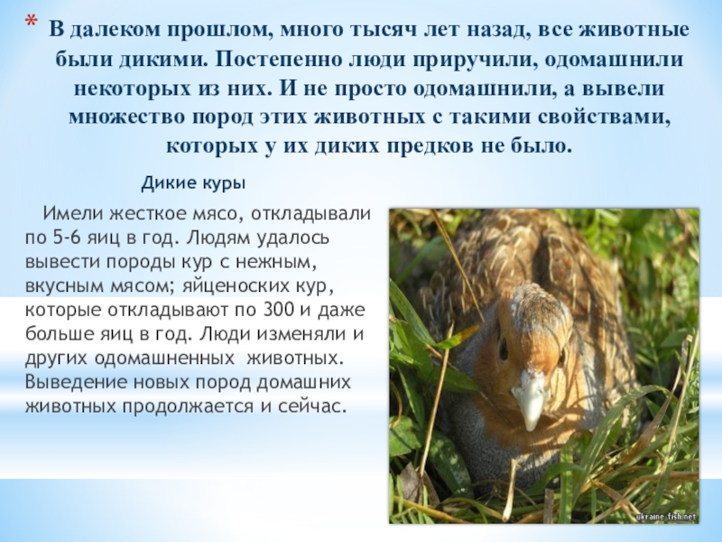 Имели жесткое мясо, откладывали по 5-6 яиц в год. Людям удалось вывести породы кур с нежным, вкусным мясом; яйценоских кур, которые откладывают по 300 и даже больше яиц в год. Люди изменяли и других одомашненных животных. Выведение новых пород домашних животных продолжается и сейчас.