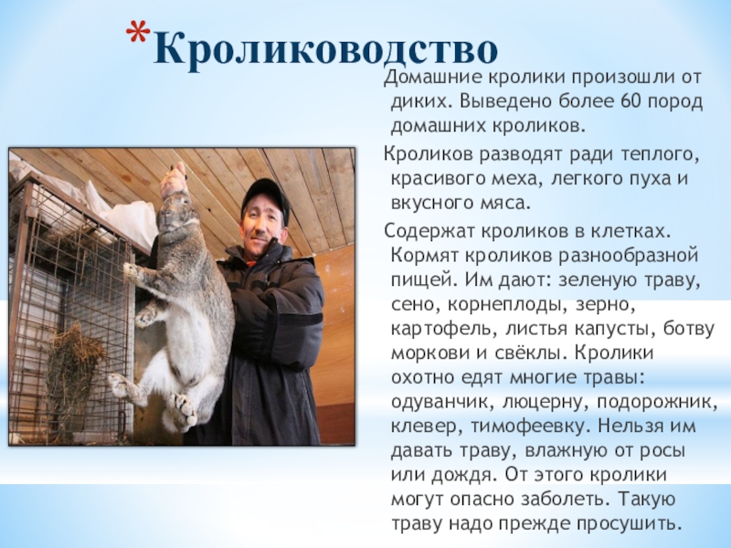 Содержат кроликов в клетках. Кормят кроликов разнообразной пищей. Им дают: зеленую траву, сено, корнеплоды, зерно, картофель, листья капусты, ботву моркови и свёклы. Кролики охотно едят многие травы: одуванчик, люцерну, подорожник, клевер, тимофеевку. Нельзя им давать траву, влажную от росы или дождя. От этого кролики могут опасно заболеть. Такую траву надо прежде просушить.