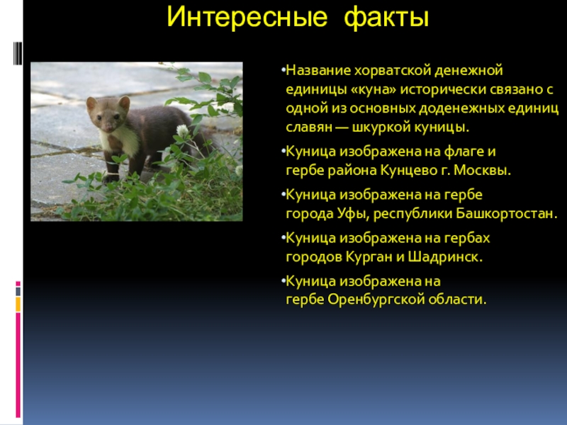 Интересные факты Название хорватской денежной единицы «куна» исторически связано с одной из основных доденежных единиц славян — шкуркой куницы.Куница
