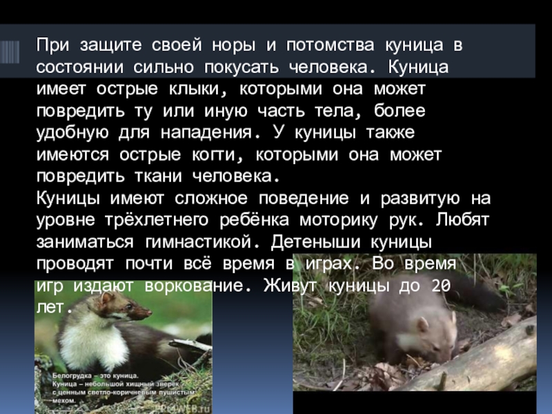Слайд 3При защите своей норы и потомства куница в состоянии сильно покусать