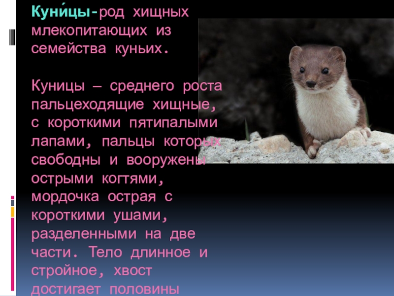 Слайд 2Куни́цы-род хищных млекопитающих из семейства куньих.   Куницы — среднего роста пальцеходящие хищные, с короткими