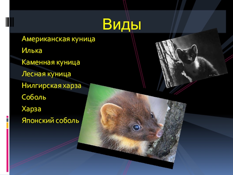 Американская куницаИлькаКаменная куницаЛесная куницаНилгирская харзаСобольХарзаЯпонский собольВиды