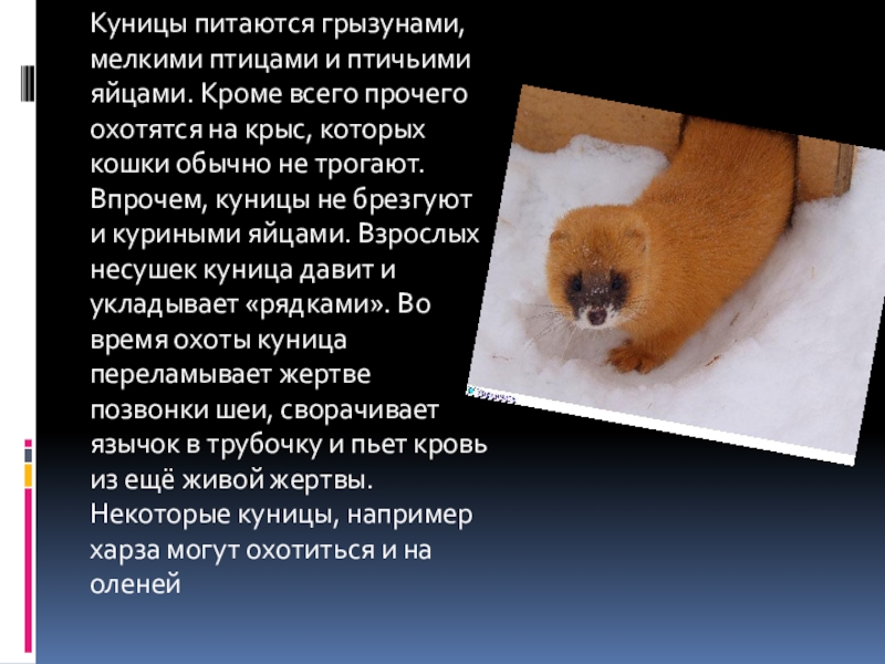 Слайд 4Куницы питаются грызунами, мелкими птицами и птичьими яйцами. Кроме всего прочего