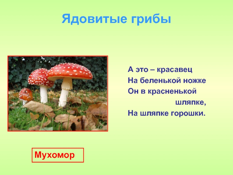Ядовитые грибы А это – красавецНа беленькой ножкеОн в красненькой