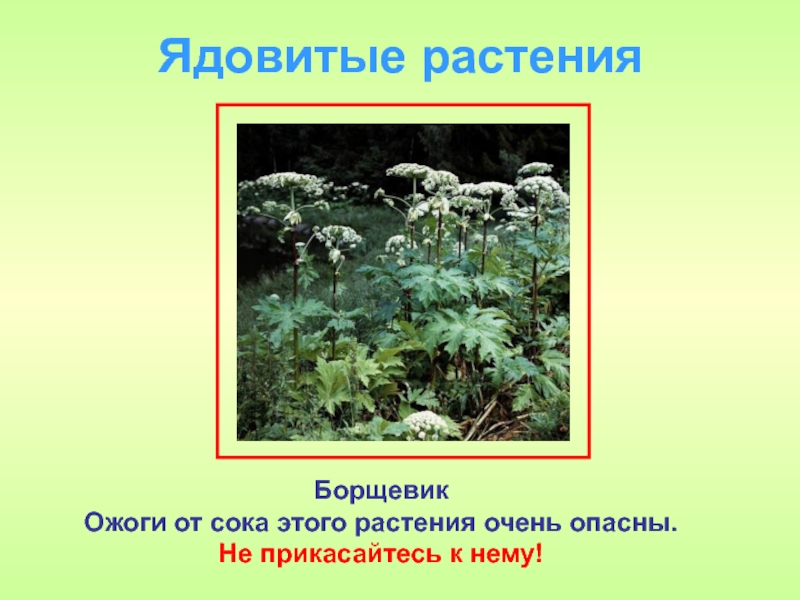 Ядовитые растенияБорщевикОжоги от сока этого растения очень опасны.Не прикасайтесь к нему!