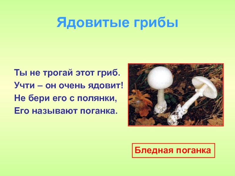 Ядовитые грибыТы не трогай этот гриб.Учти – он очень ядовит!Не бери его с полянки,Его называют поганка.Бледная поганка