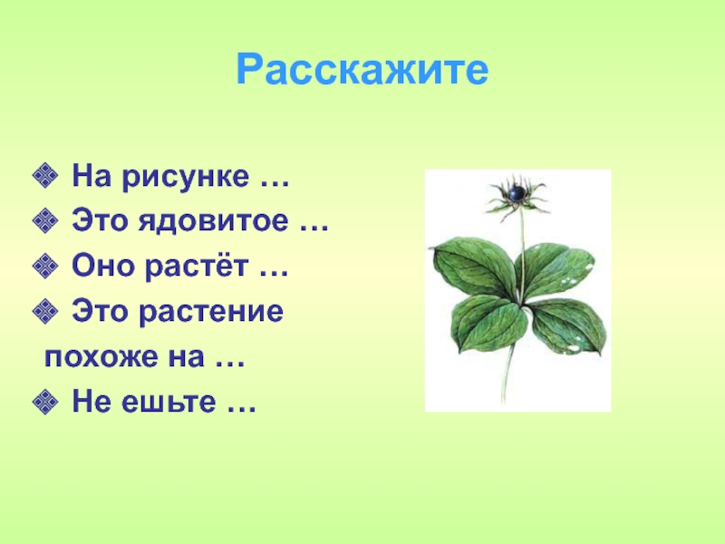 Расскажите На рисунке …Это ядовитое …Оно растёт …Это растение похоже на …Не ешьте …