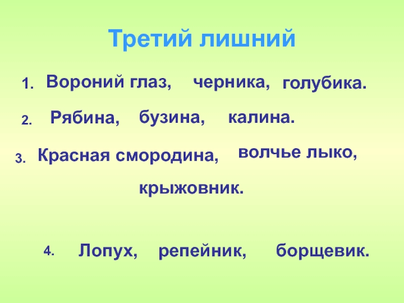 Третий лишнийВороний глаз,черника,голубика.Рябина,бузина,калина.Красная смородина,волчье лыко,крыжовник.Лопух,репейник, борщевик.1.2.3.4.