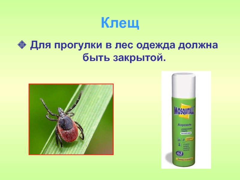 Клещ Для прогулки в лес одежда должна быть закрытой.