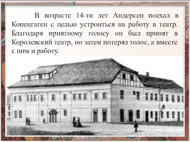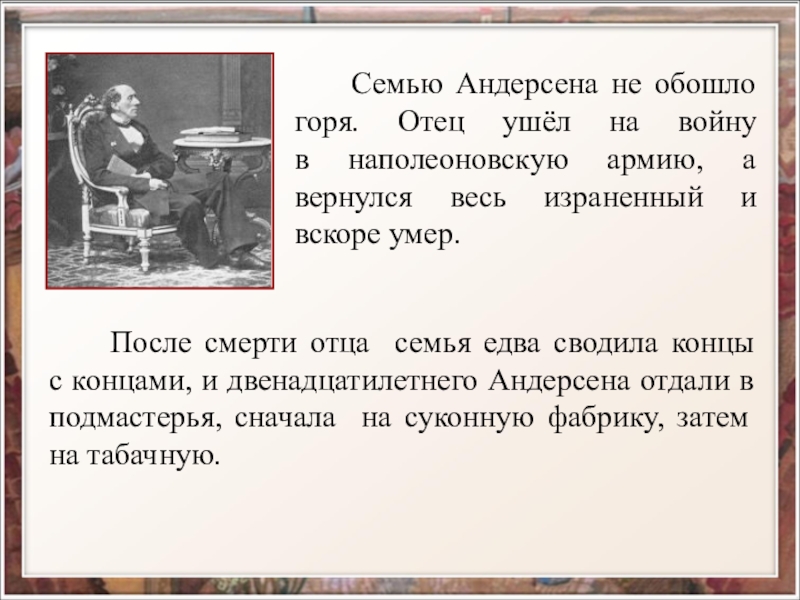 После смерти отца семья едва сводила концы с концами, и двенадцатилетнего Андерсена отдали в подмастерья, сначала на суконную фабрику, затем на табачную.