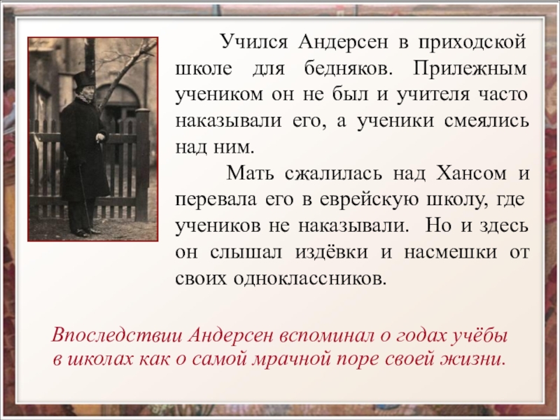 Впоследствии Андерсен вспоминал о годах учёбы