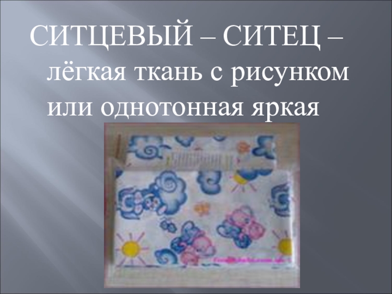 Слайд 14СИТЦЕВЫЙ – СИТЕЦ – лёгкая ткань с рисунком или однотонная яркая