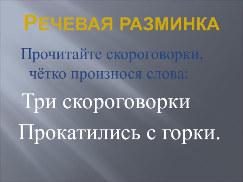 РЕЧЕВАЯ РАЗМИНКА Прочитайте скороговорки, чётко произнося слова: Три скороговоркиПрокатились с горки.
