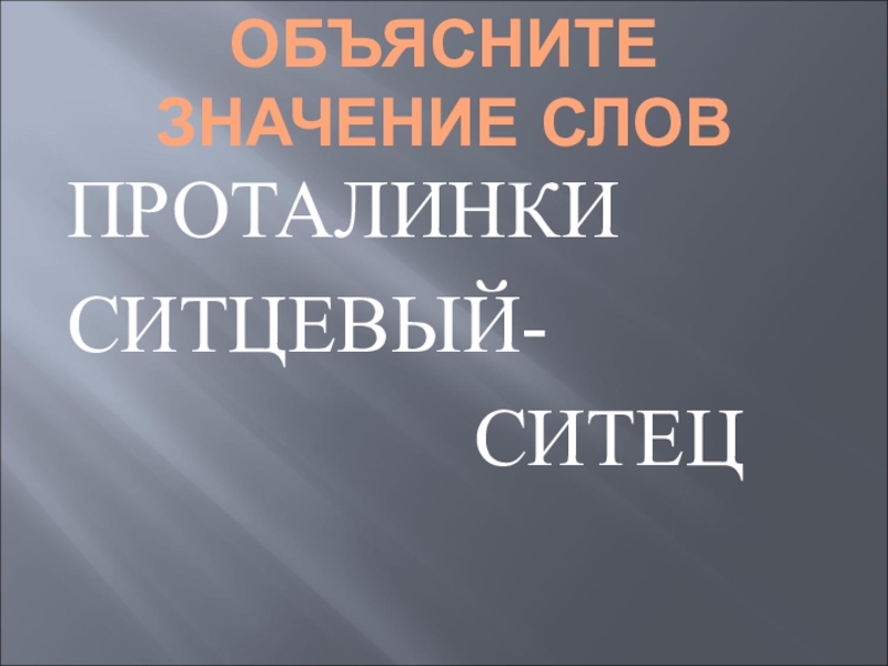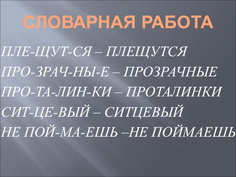 СЛОВАРНАЯ РАБОТАПЛЕ-ЩУТ-СЯ – ПЛЕЩУТСЯПРО-ЗРАЧ-НЫ-Е – ПРОЗРАЧНЫЕПРО-ТА-ЛИН-КИ – ПРОТАЛИНКИСИТ-ЦЕ-ВЫЙ – СИТЦЕВЫЙНЕ ПОЙ-МА-ЕШЬ –НЕ ПОЙМАЕШЬ