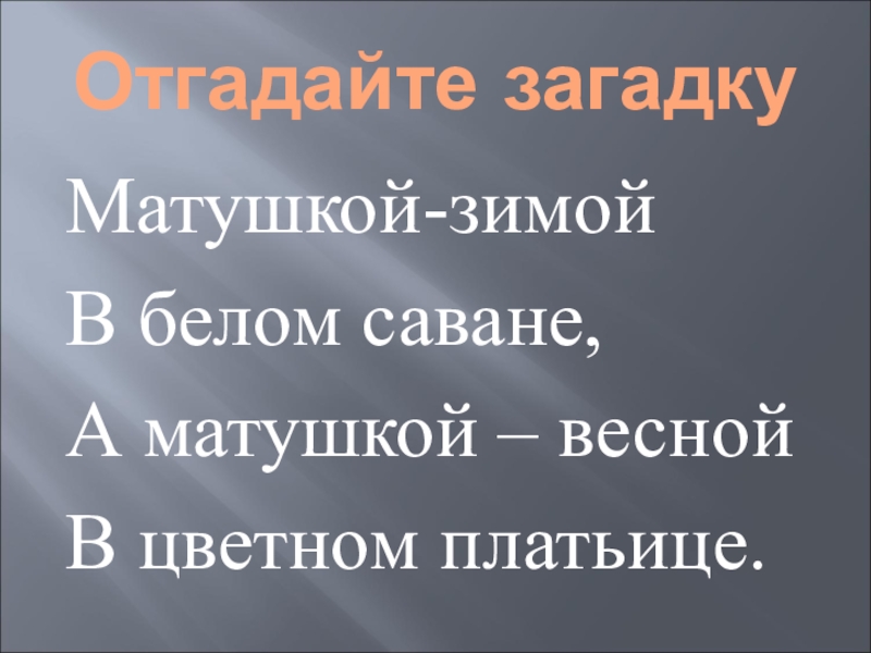 Отгадайте загадкуМатушкой-зимойВ белом саване, А матушкой – веснойВ цветном платьице.