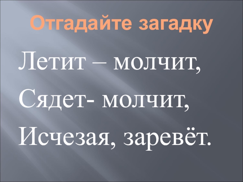 Отгадайте загадкуЛетит – молчит,Сядет- молчит,Исчезая, заревёт.