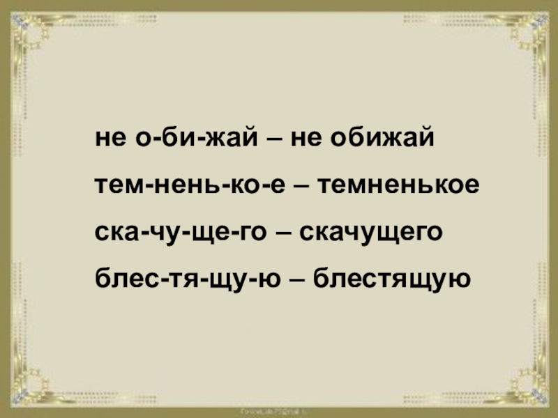 не о-би-жай – не обижай тем-нень-ко-е – темненькое ска-чу-ще-го – скачущего блес-тя-щу-ю – блестящую