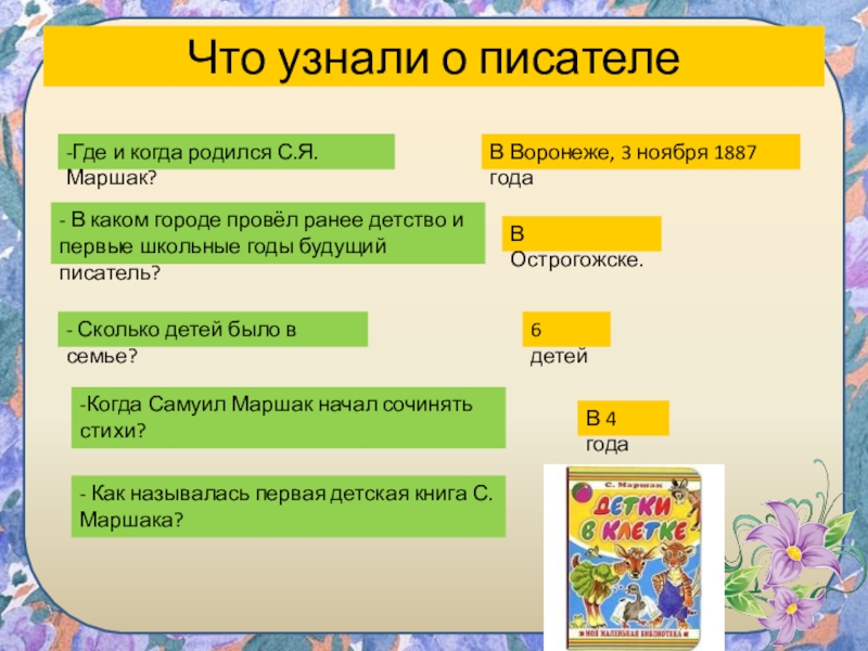 - Маршака можно сравнить с добрым волшебником, а его стихи с волшебной палочкой. Прочитайте их, и они исполнят любое ваше желание.