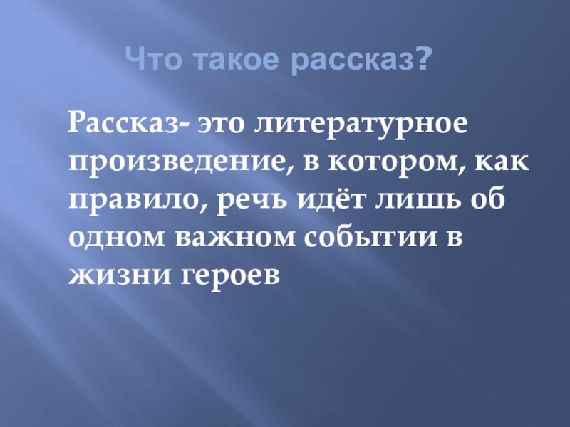 Что такое рассказ?  Рассказ- это литературное произведение, в котором, как правило, речь идёт лишь об одном