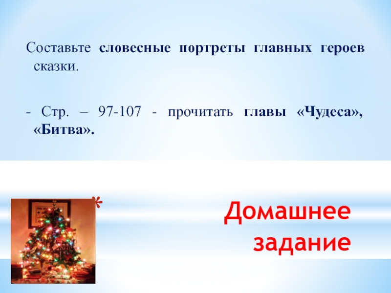 Домашнее заданиеСоставьте словесные портреты главных героев сказки. - Стр.