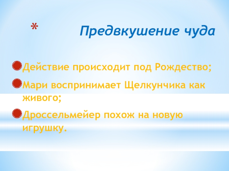 Предвкушение чудаДействие происходит под Рождество;Мари воспринимает Щелкунчика как живого;Дроссельмейер похож на новую