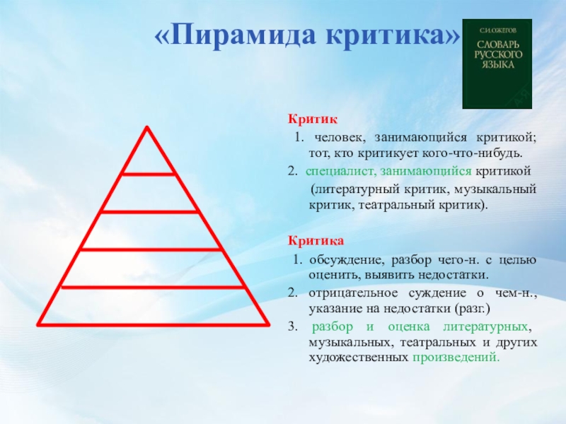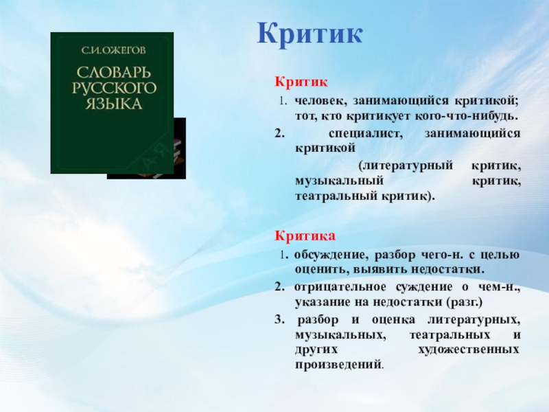 1. человек, занимающийся критикой; тот, кто критикует кого-что-нибудь.