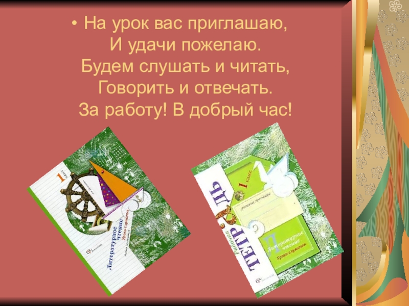На урок вас приглашаю, И удачи пожелаю.  Будем слушать и читать, Говорить и отвечать. За работу! В добрый час!