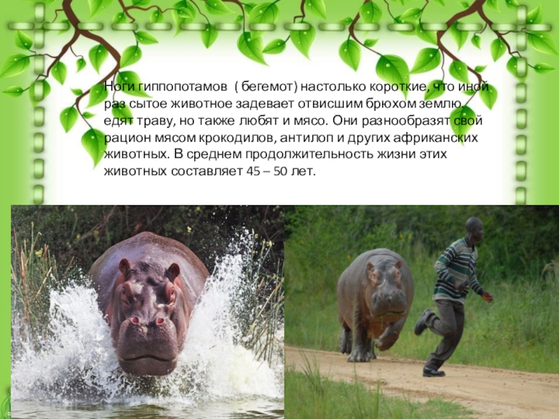 едят траву, но также любят и мясо. Они разнообразят свой рацион мясом крокодилов, антилоп и других африканских животных. В среднем продолжительность жизни этих животных составляет 45 – 50 лет.