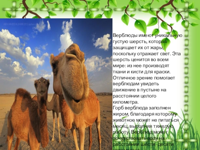 Горб верблюда заполнен жиром, благодаря которому животное может не питаться месяц, выполняя тяжелую работу. Верблюд может почувствовать воду на расстоянии шести -десяти километров.